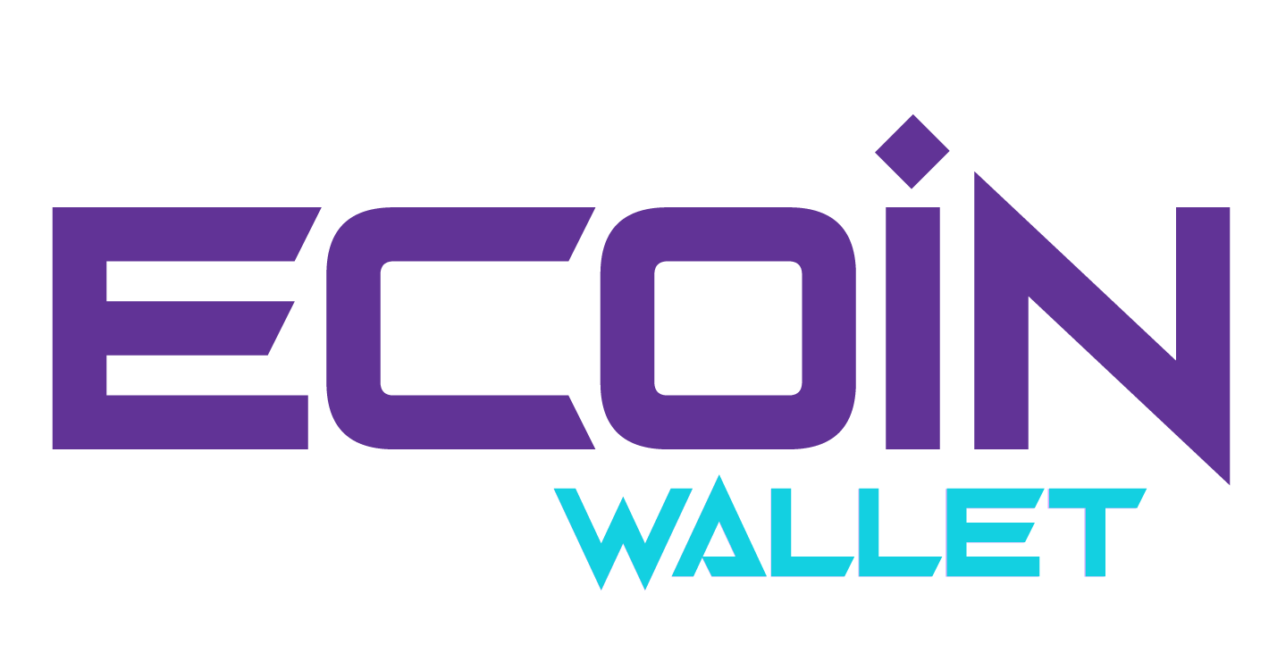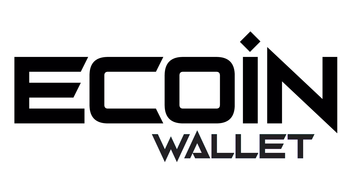 The word "WALLET," below "ECOIN," complements the visual identity, conveying trust and security. The simplicity of the logo allows it to be easily recognized, and it reflects the values and services of Ecoin Wallet, helping to build recognition and trust among users.