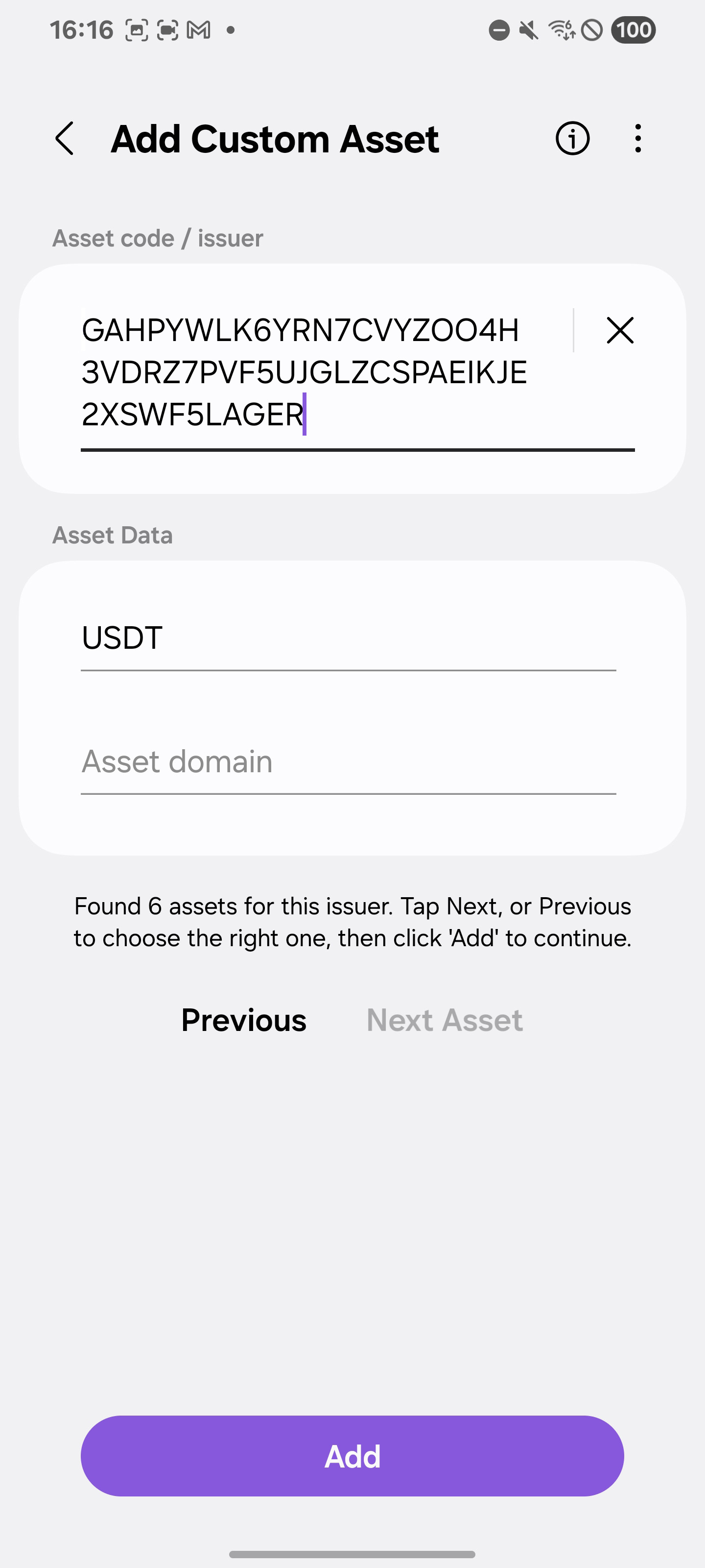 - Flexible Import: Paste both the asset code and issuer for direct import, or enter only the issuer to navigate between available assets using the Next and Previous options before adding.