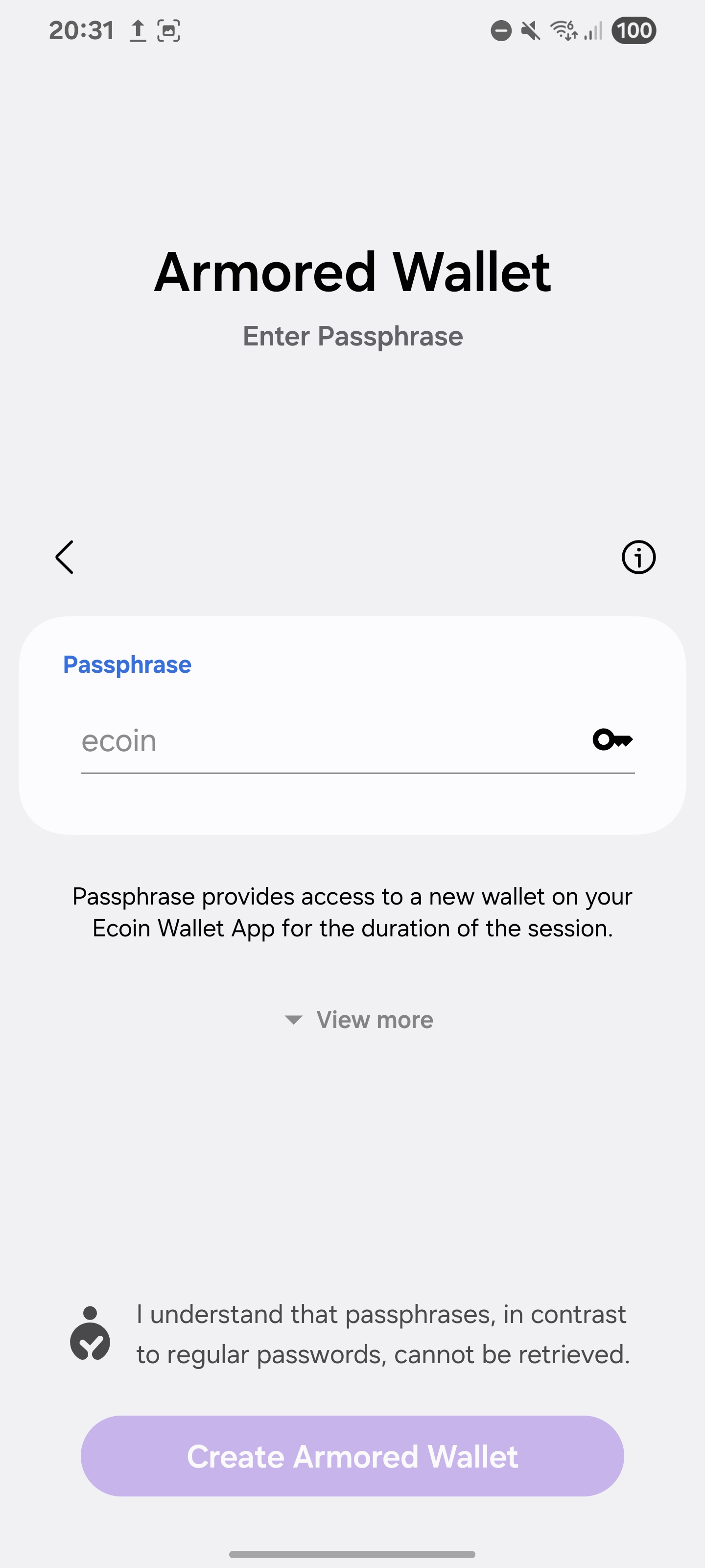 - Passphase Support: Ecoin Wallet also supports wallets with an additional passphrase (called #Armored Wallets), allowing users to use the 13- or 25-word in their seed phrases. This ensures enhanced security and full compatibility with passphrases from hardware wallets like Ledger.