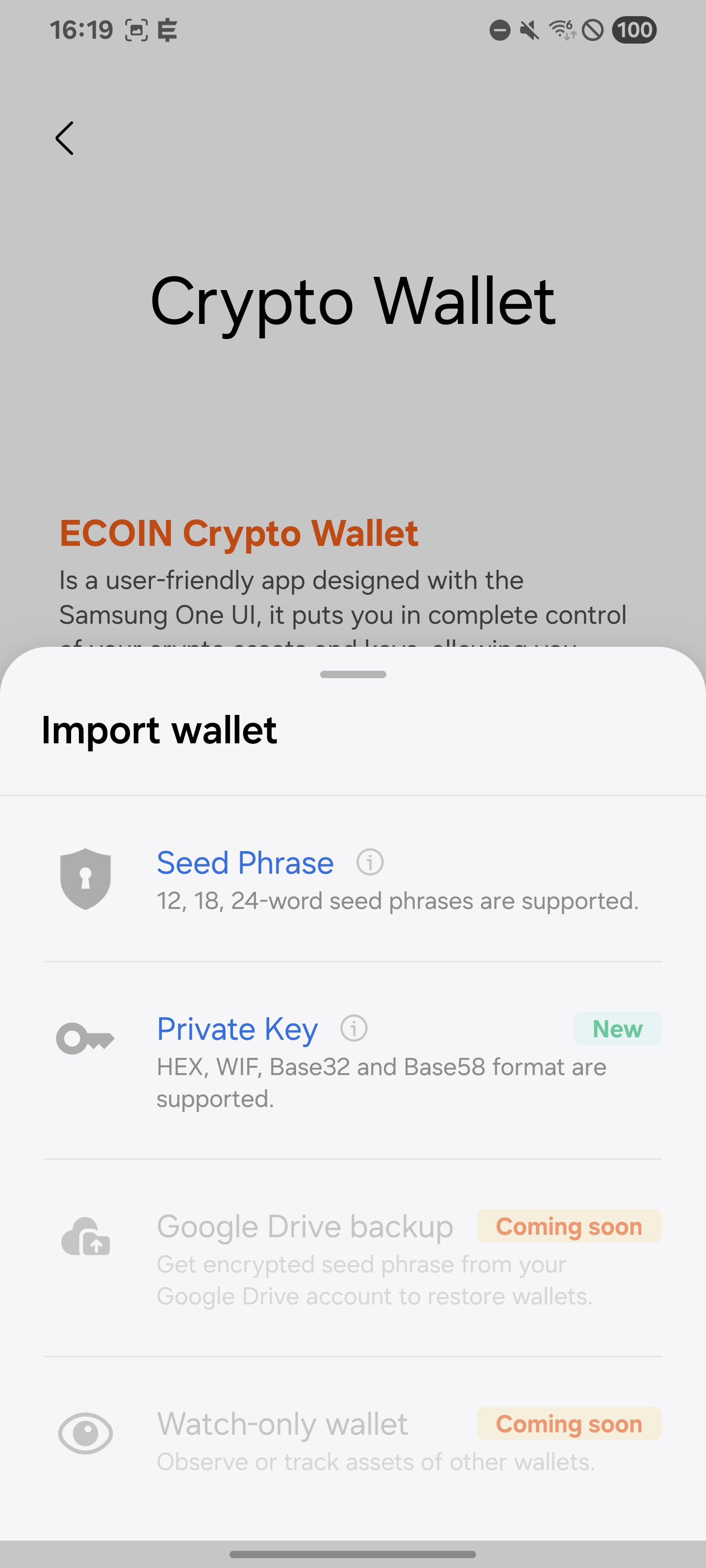 - Seed Phrase Support: Ecoin Wallet supports importing wallets with 12- and 24-word seed phrases, offering a secure and straightforward method to restore or migrate wallets.