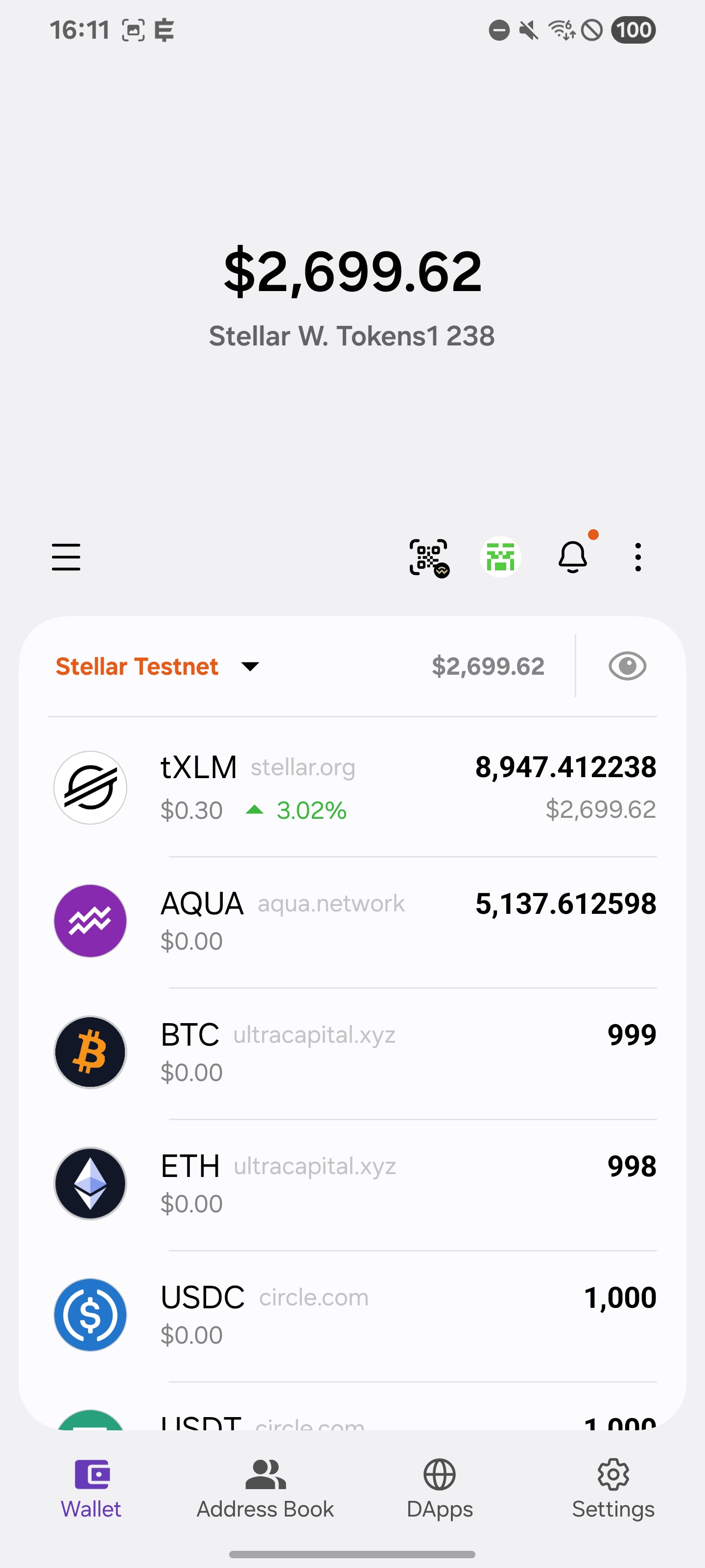 - Assets List: Explore your Stellar assets with live price updates, percentage change, and individual balances displayed clearly. Each asset also shows its issuer name, helping you easily identify the legitimate token among similar ones — a key detail in the Stellar ecosystem.