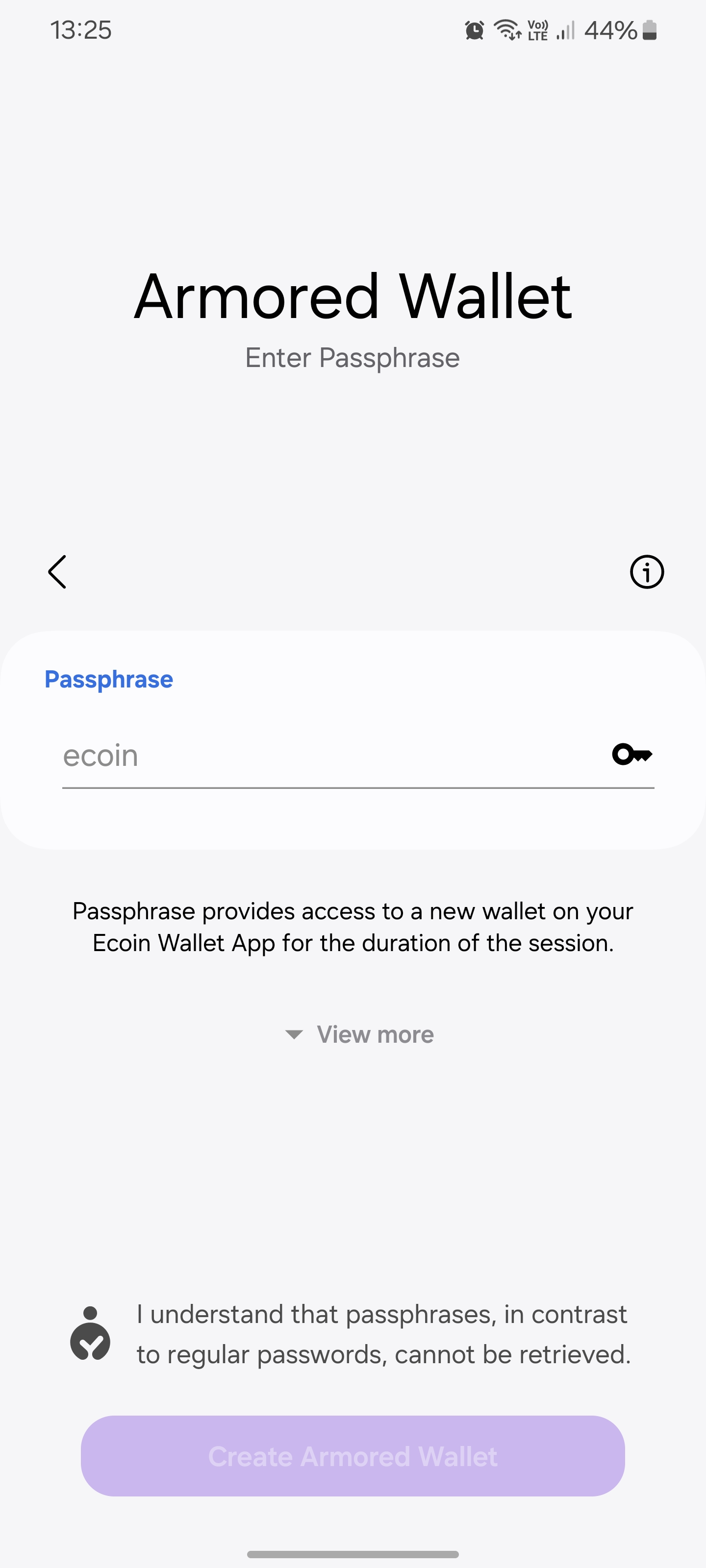 - Passphase Support: Ecoin Wallet also supports wallets with an additional passphrase (called #Armored Wallets), allowing users to use the 13- or 25-word in their seed phrases. This ensures enhanced security and full compatibility with passphrases from hardware wallets like Ledger.