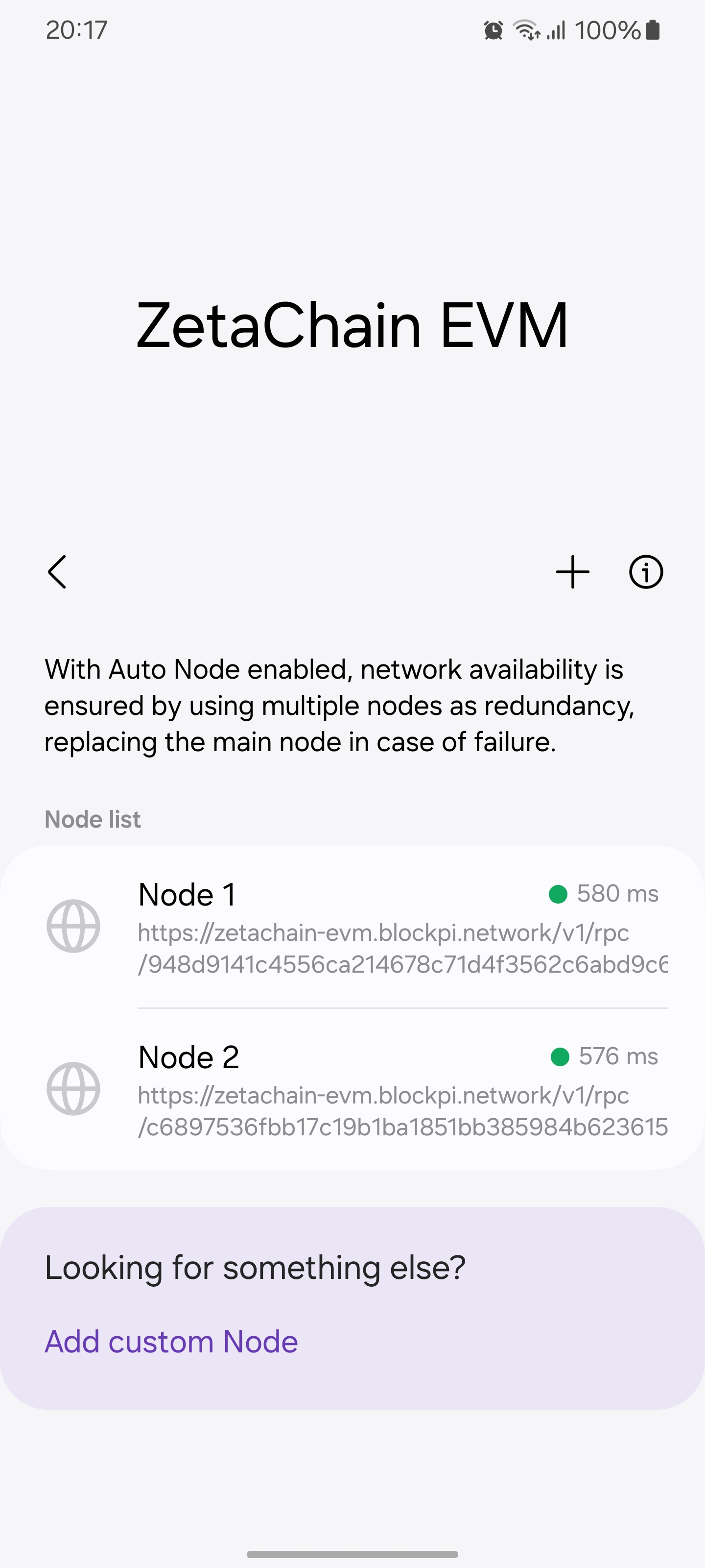 - Custom Node Support: Advanced users can add their own RPC endpoints, allowing complete control over their ZetaChain network connection.