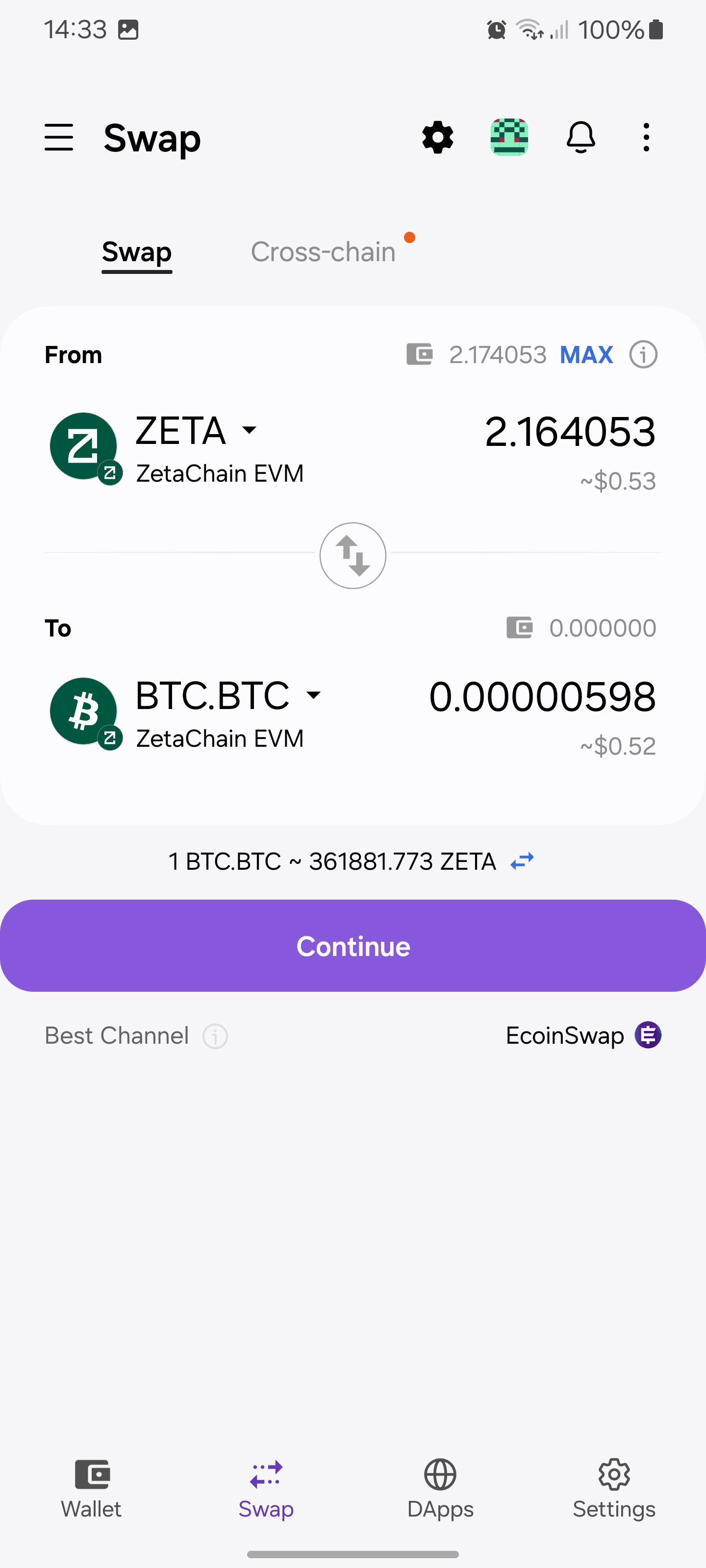 - Best Rates: Ecoin Wallet leverages ZetaChain’s infrastructure to guarantee competitive rates for cross-chain swaps, maximizing the value of your transactions.