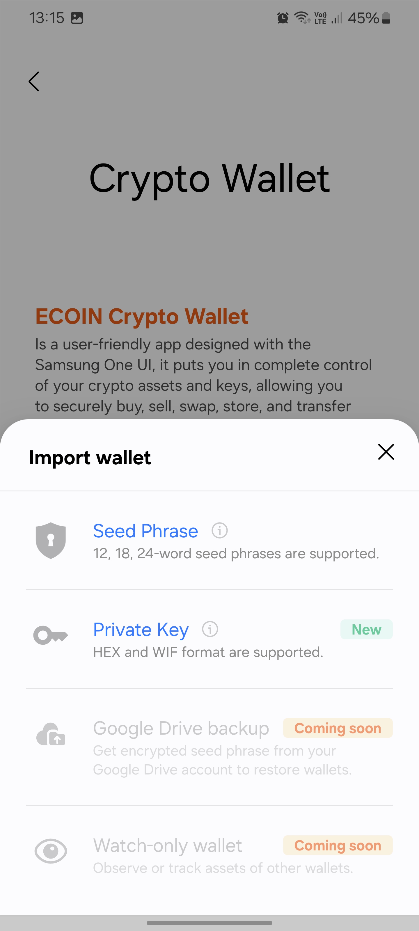 - Seed Phrase Support: Ecoin Wallet supports importing wallets with 12- and 24-word seed phrases, offering a secure and straightforward method to restore or migrate wallets.