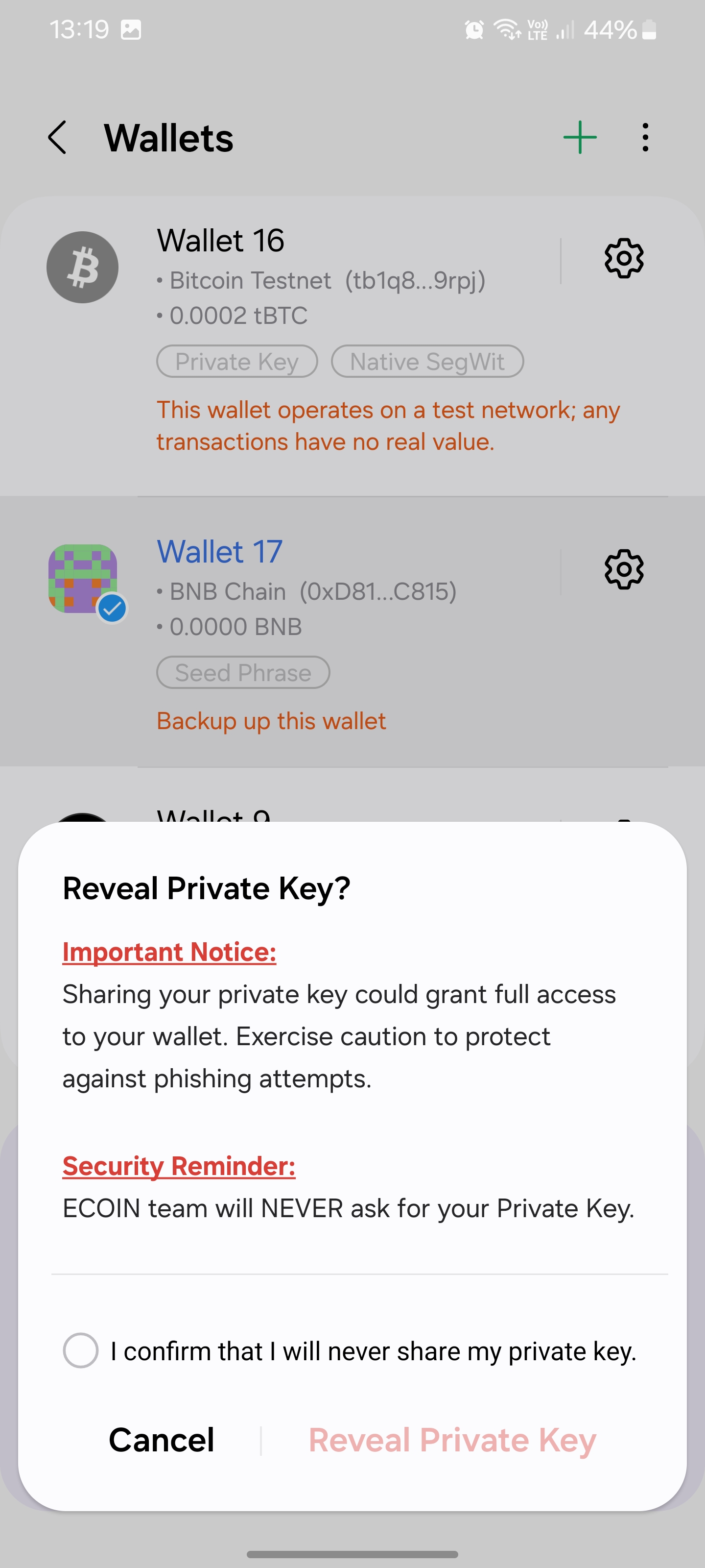 Ecoin Wallet provides the ability export private keys, supporting both HEX formats for Ethereum, and WIF (Wallet Import Format) for Bitcoin. This feature ensures that users can securely manage their private keys and transfer them between different wallets as needed. Note that some wallets do not support the export of private keys, which limits user control over their funds.
